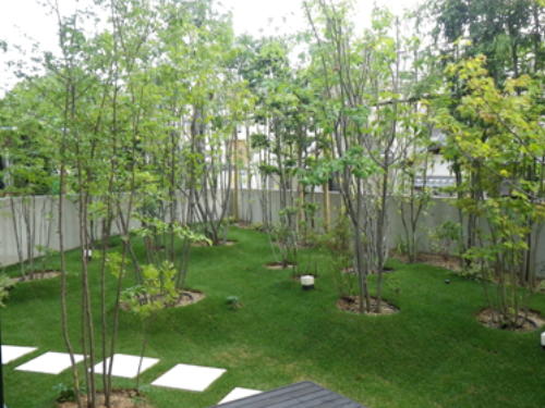 目隠しにシラカシ株立を列植し、アオダモ、シロキ、シマトネリコ、常緑ヤマボウシ、ジューンベリー、ヒナウチワカエデ、ハウチワカエデ、アズキナシ、ツリバナ、アカエゴ等を配し、シンボルツリーにヤマザクラ株立を植樹しました。